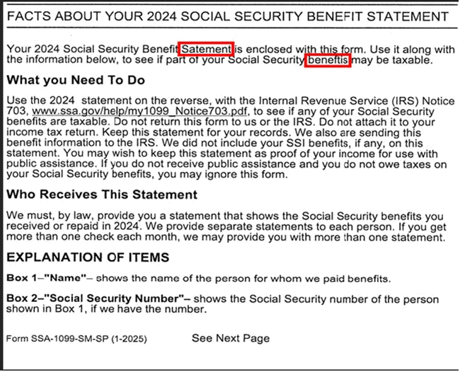 The typographical errors appear under the header “Facts About Your 2024 Social Security Benefit Statement”. On the first line the word “Statement” may be spelled “Satement” and the second error may be in the second line of the same paragraph (4 words from the end) the with the word “benefits’ which may be spelled “benefts”. Beneficiaries or representative payees may contact their local field office due to suspicion from the incorrect spellings. We have included the image below for your reference.