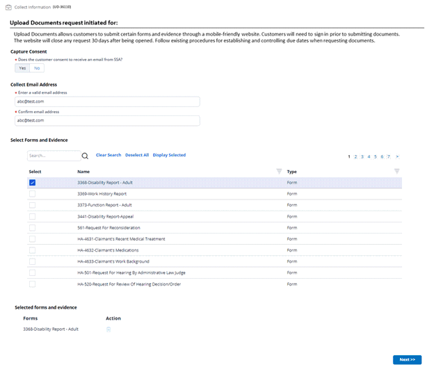 During interactions with customers (e.g., taking an initial claim, performing a redetermination, or updating their personal information) technicians will determine whether they require additional forms or evidence to complete an action. If any evidence or forms on the lists in Sections F and G are required, the SSA technician will inform the individual verbally about the required information and will offer the opportunity to provide it electronically via Upload Documents.